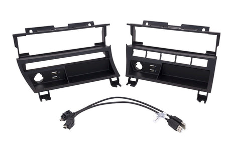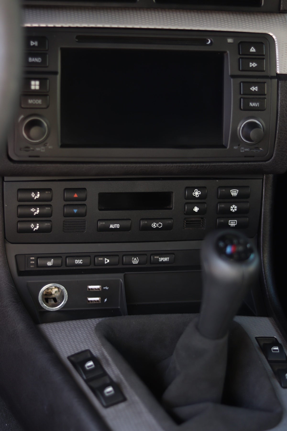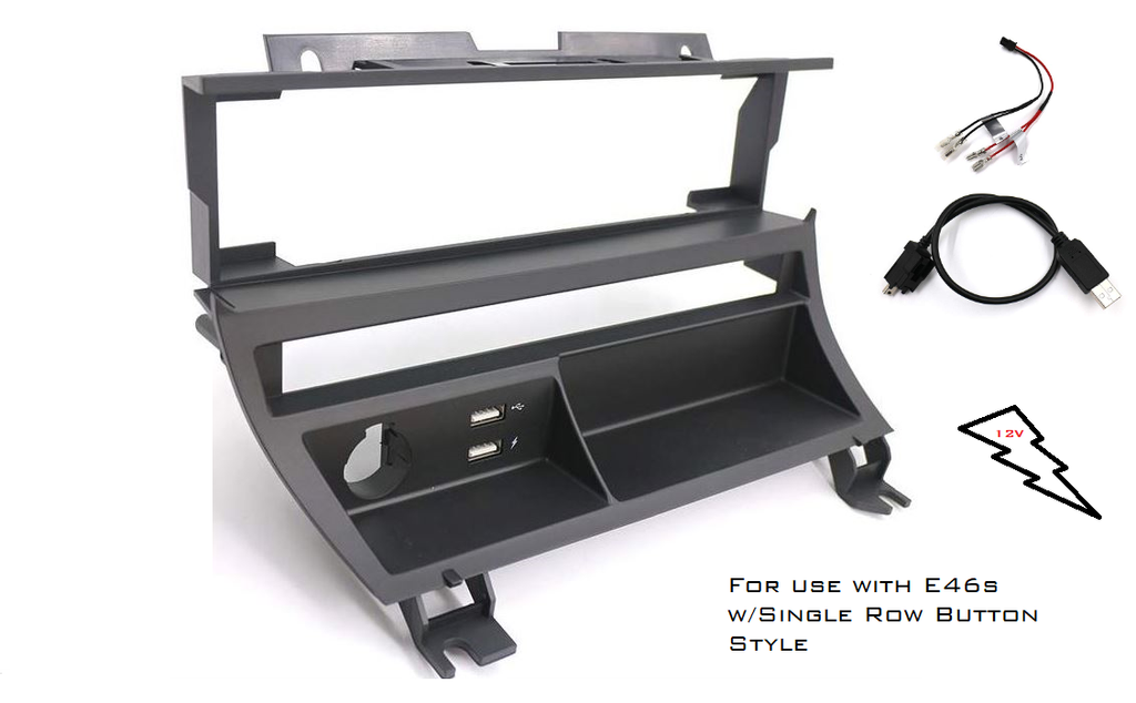 All BMW E46s without OEM navigation require the HVAC relocation bracket (either the "single row" or "individual row") to install a double-din radio such as the Dynavin or any other aftermarket unit. This bracket includes two USB ports --one for USB charging (3A or 12V) and one for multimedia that plugs into the back of the Dynavin or other aftermarket radio. Eliminates the ashtray compartment.