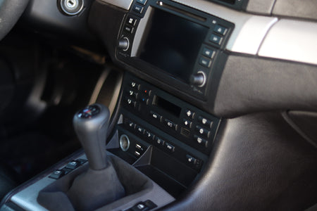 For BMW E46s switching to a double-din head unit (Dynavin) where all the buttons above the ashtray are housed in a single assembly with center-mounted switches. The single row version is for switches that are part of and pull out as a long, single unit. You may have any number of buttons but note there are NO SEAMS BETWEEN the buttons. Newer E46 models particularly the M3 typically have the "single row" configuration.
